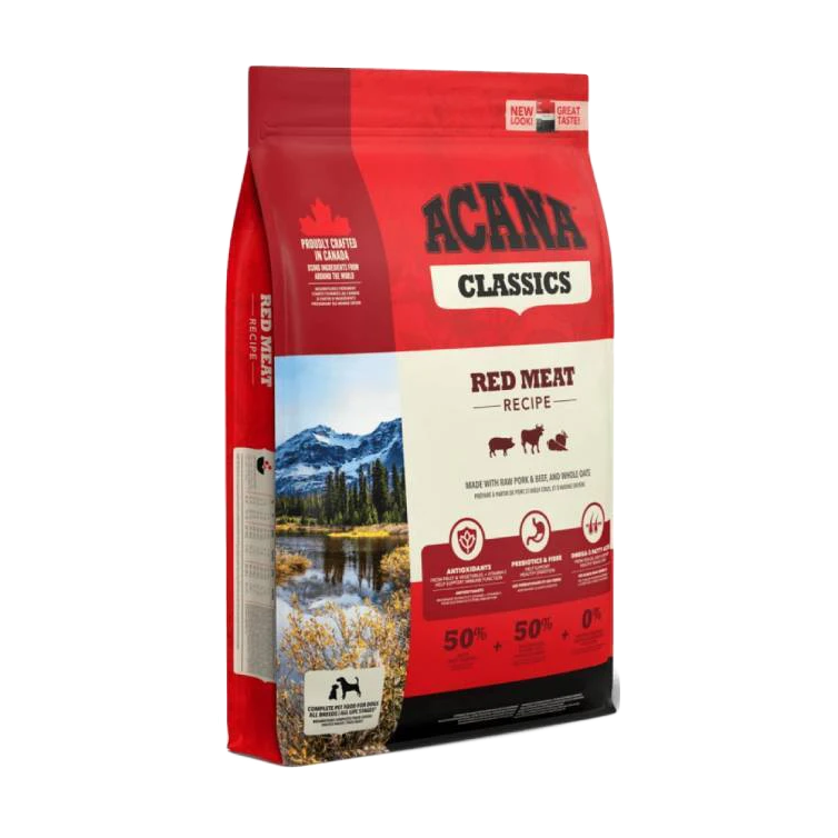 Η ACANA CLASSICS RED Meat περιέχει αρνί που τρέφεται με χόρτα, βοδινό angus και χοιρινό Yorkshire που παραδίδονται καθημερινά φρέσκα ή ωμά σε WHOLEPREY™ αναλογίες, για να θρέψει πλήρως τον σκύλο σας. Χωρίς σιτηρά υψηλού γλυκαιμικού δείκτη , η ACANA ξεχειλίζει με θρεπτική ζωική πρωτεΐνη και ΩΜΕΓΑ-3 λιπαρά οξέα , που προάγουν βέλτιστη υγεία.