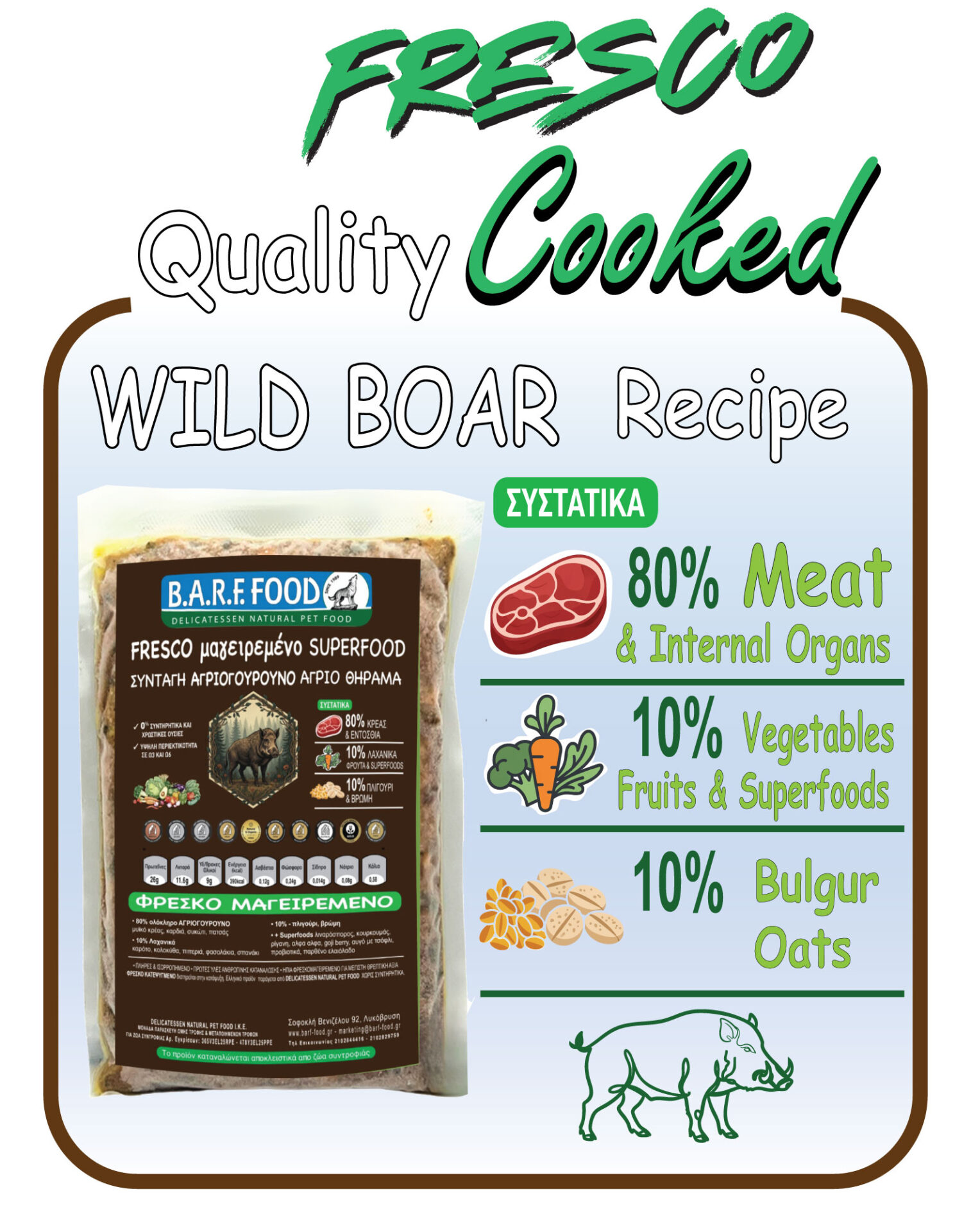 Το WILD BOAR RECIPE είναι μια εξαιρετική επιλογή για σκύλους και γάτες που αναζητούν μια πλούσια και θρεπτική διατροφή. Με 80% φρέσκο αγριογούρουνο, 10% λαχανικά & superfoods και 10% πλιγούρι & βρώμη, προσφέρει υψηλή περιεκτικότητα σε πρωτεΐνες (23%) με μέτρια λιπαρά (13,5%).
