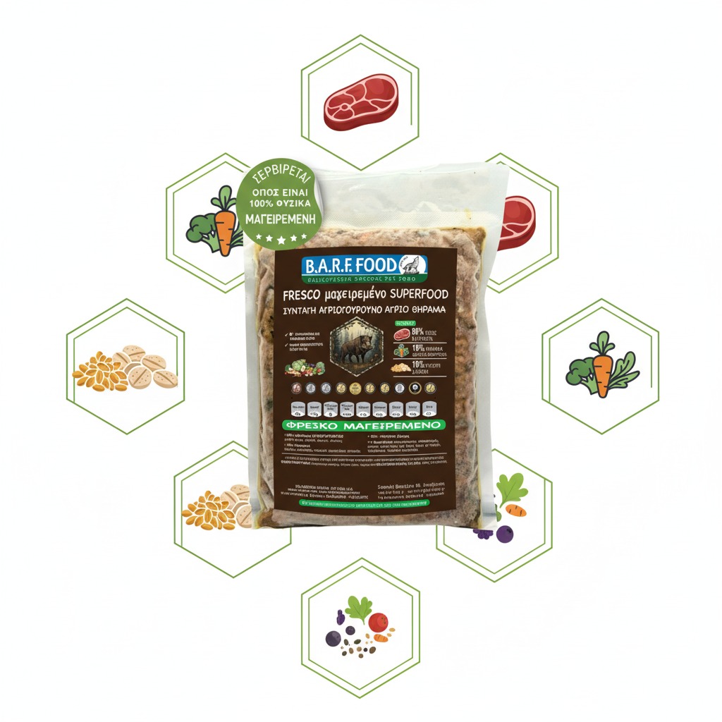 Το αγριογούρουνο είναι μια εξαιρετική πηγή πρωτεΐνης, πλούσια σε βιταμίνες B, σίδηρο και ψευδάργυρο. Η ήπια μαγειρική διαδικασία διατηρεί όλα τα θρεπτικά συστατικά του κρέατος, ενώ τα φρούτα και λαχανικά προσφέρουν φυσικές βιταμίνες και αντιοξειδωτικά. Ιδανική για ενεργούς σκύλους, αθλητικές ράτσες και σκύλους που χρειάζονται υψηλή πρωτεΐνη για μυϊκή ανάπτυξη. 100% φυσικό ελληνικό προϊόν – απλά ξεπαγώνει και σερβίρεται!