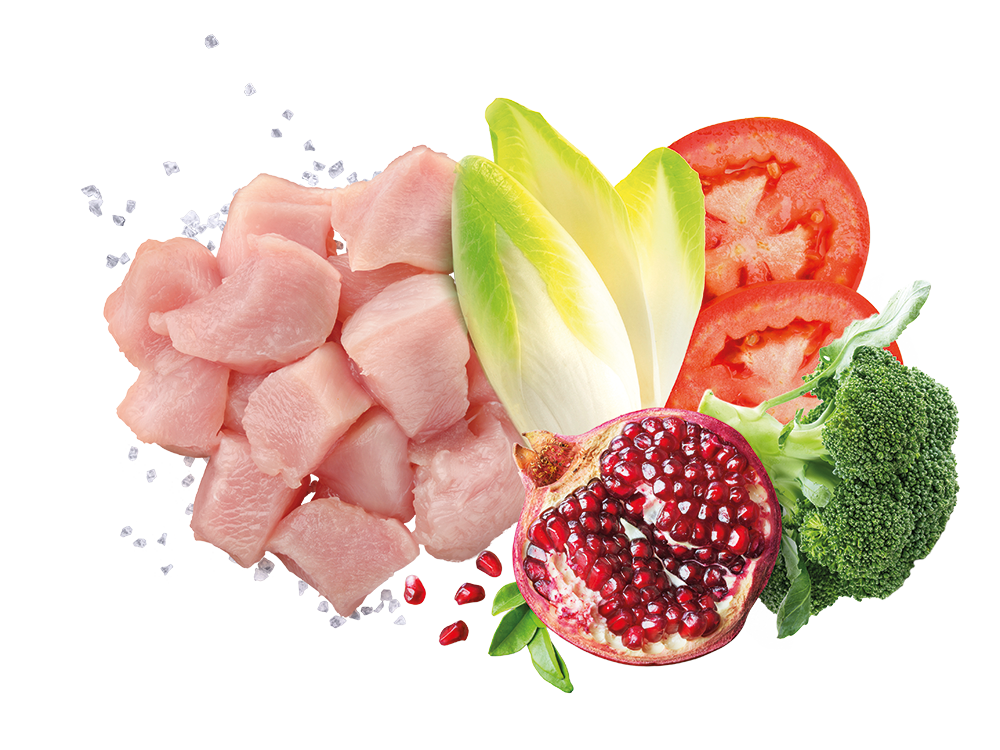 Αφυδατωμένο κοτόπουλο (30%), ρύζι, αρακάς, λίπος χοιρινού, υδρολυμένες ζωικές πρωτεΐνες χαμηλού μοριακού βάρους, αφυδατωμένο τριφύλλι, κάνναβη (1%), μαγιά, αποξηραμένος πολτός ραδικιού (0,5%), χλωριούχο νάτριο, φωσφορικό μονονάτριο, έλαιο καμελίνας (0,3%), ελαιόλαδο (0,3%), β-1,3 γλυκάνες από φύκος Euglena gracilis (0,06%), γλυκοζαμίνη (0,04%), αφυδατωμένο μπρόκολο (0,03%), αφυδατωμένο ρόδι (0,03%), αφυδατωμένη ντομάτα (0,03%), yucca mojave, θειικό χονδροϊτίνης (0,01%).