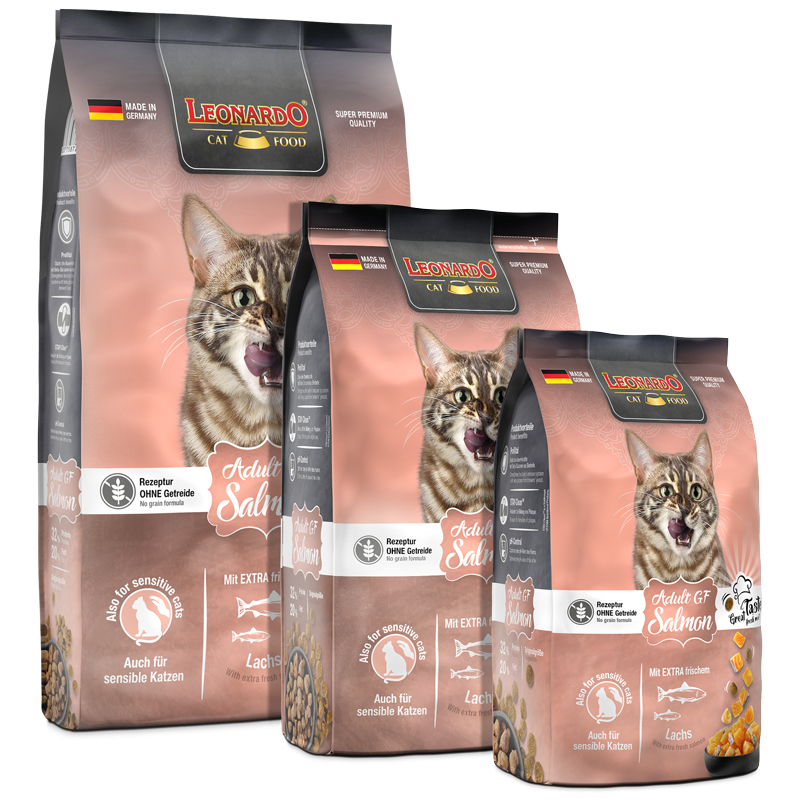 Με έξτρα φρέσκο σολομό για τους αληθινούς λάτρεις του ψαριού, το LEONARDO Adult GF Salmon είναι ακαταμάχητα νόστιμο και, χάρη στη συνταγή χωρίς δημητριακά, ιδανικό και για ευαίσθητες γάτες με δυσανεξίες ή τάση για αλλεργίες· η θρεπτική αμάρανθος αντικαθιστά τα δημητριακά και σε συνδυασμό με superfoods όπως το krill προσφέρει φυσική διατροφική αξία.
